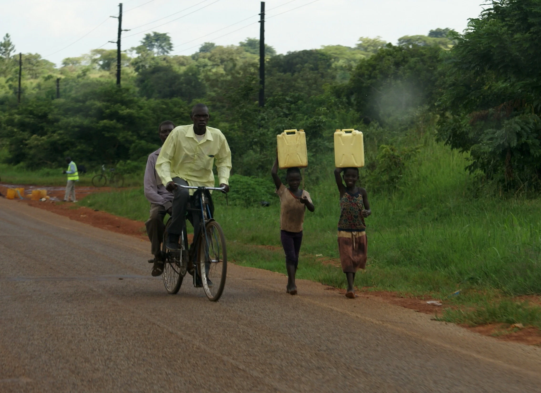 The land remains open and flat, small stands with neatly stacked fruits and vegetables for sale are found along the road, patches of papyrus reeds and sunflower fields are sprinkled about. Chickens, cows, and goats are seen moseying along the roadside seemingly unnerved by the rare occurrence of a vehicle passing by. Collections of small farms and huts begin to grow in numbers. All the while, there are people walking along, waving as the cars pass by, often times seen carrying or transporting yellow canisters filled with water - often contaminated with bacteria causing waterborne diseases. There are no big signs to specify your arrival to Alenga, but soon schools, churches, small businesses, open air-markets are seen in the distance and the feeling of community begins to rise from the tall grass.